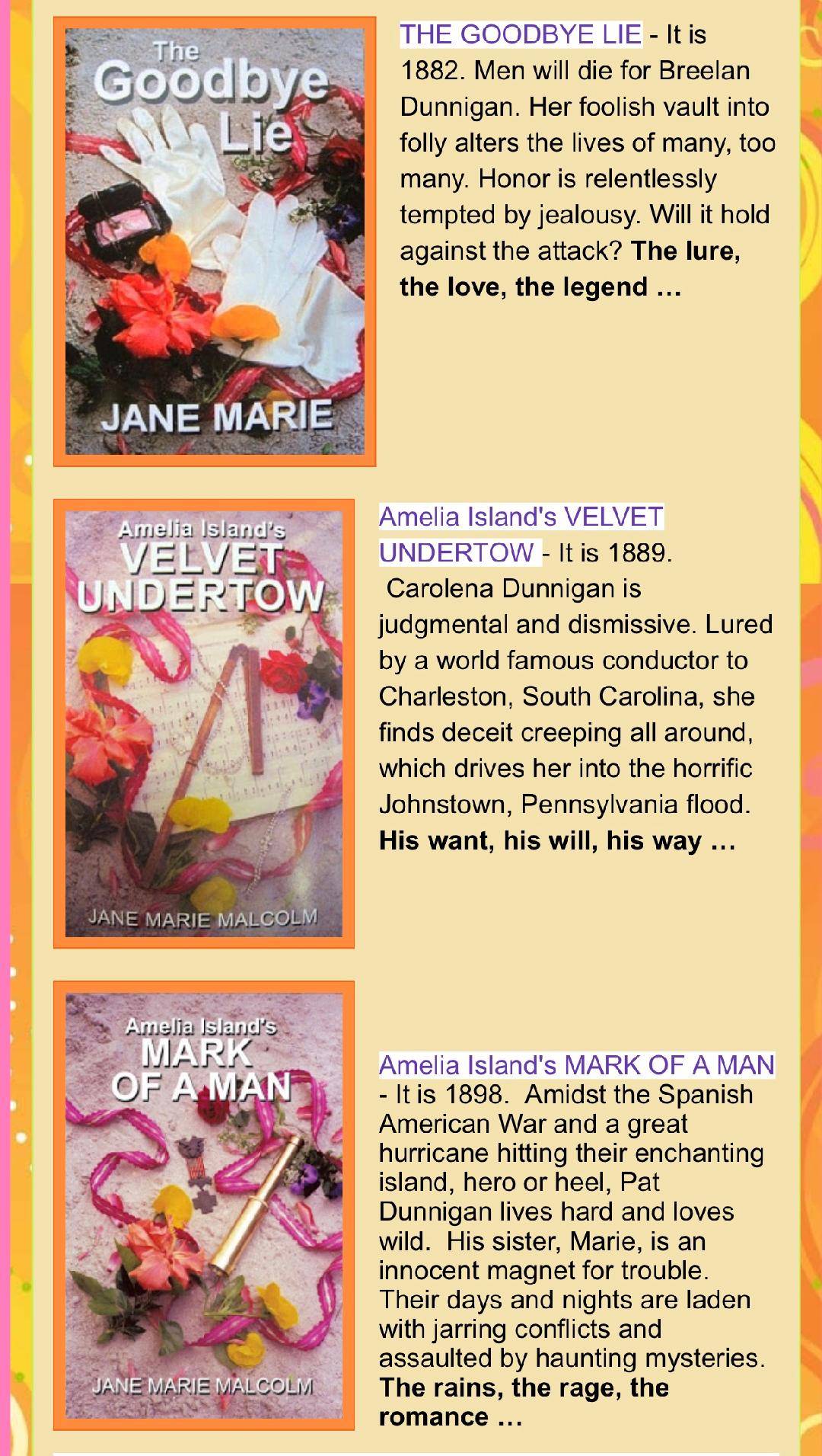 THE GOODBYE LIE Series by JANE MARIE MALCOLM - "where LITTLE HOUSE on the PRAIRIE meets GONE WITH THE WIND ..." -sweeping, stirring and lush with romance- CONTACT: graciousjanemarie@yahoo.com ... GOD'S BLESSINGS ON US ALL... "random ricochets off the backsplash of my mind" -jmm